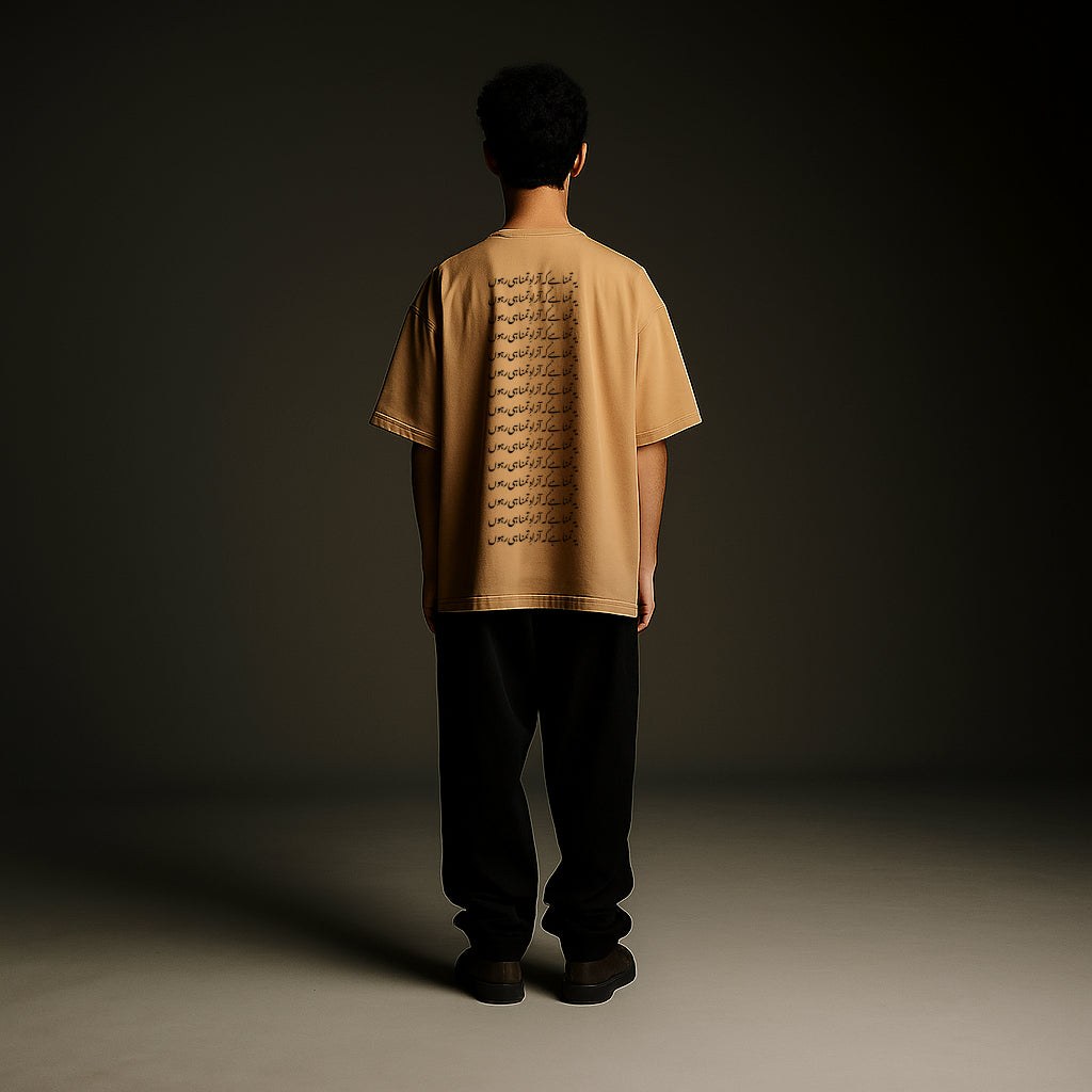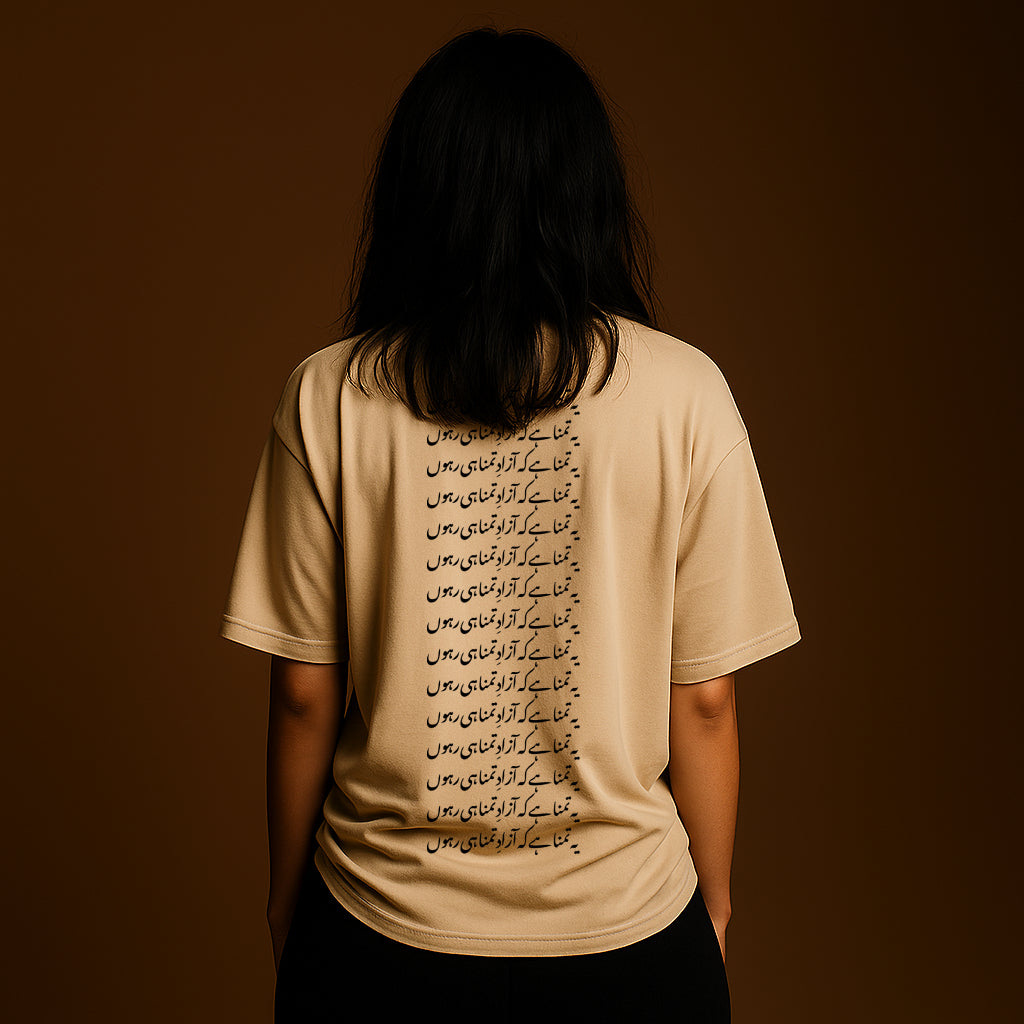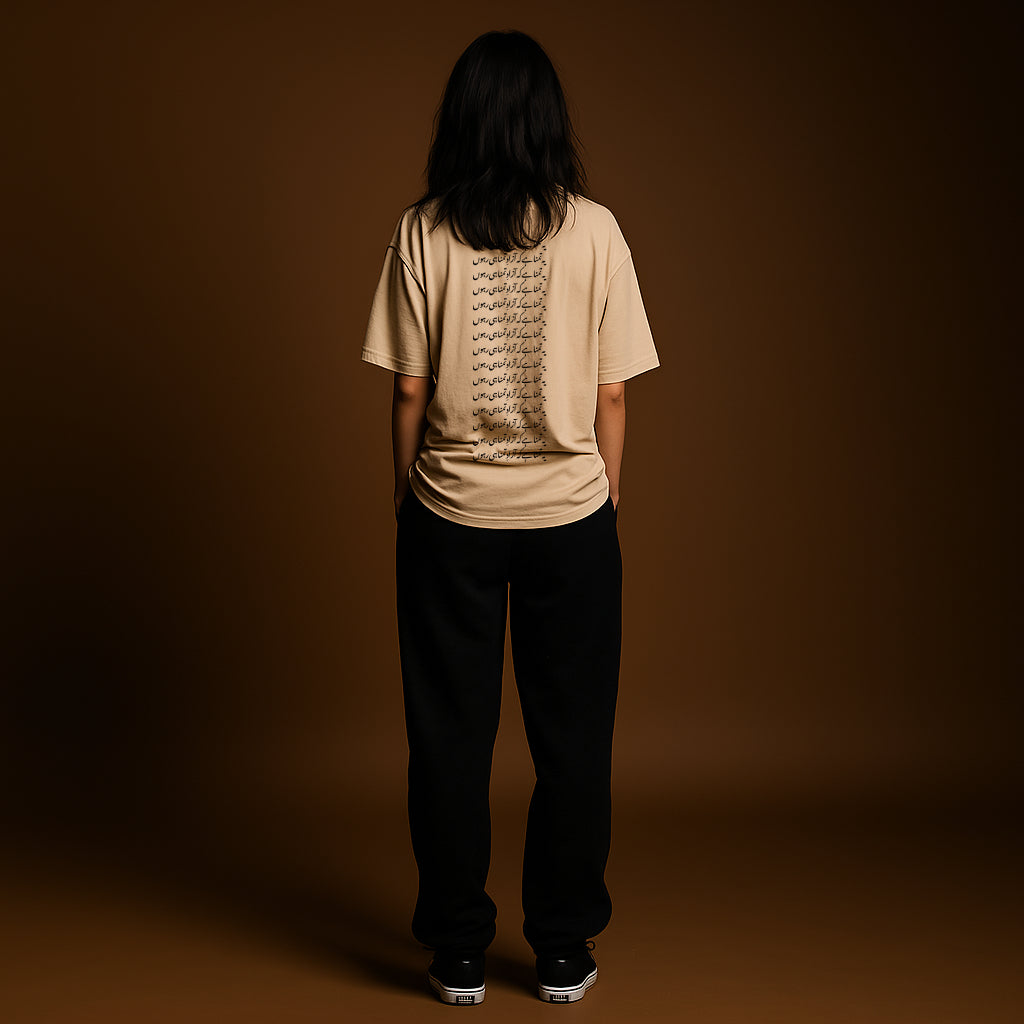 The Azad Tee is where defiance meets design. Featuring a bold fusion of Sindhi Ajrak patterns with handcrafted Urdu calligraphy, this oversized unisex tee tells a story of freedom, identity, and fearless expression.