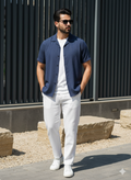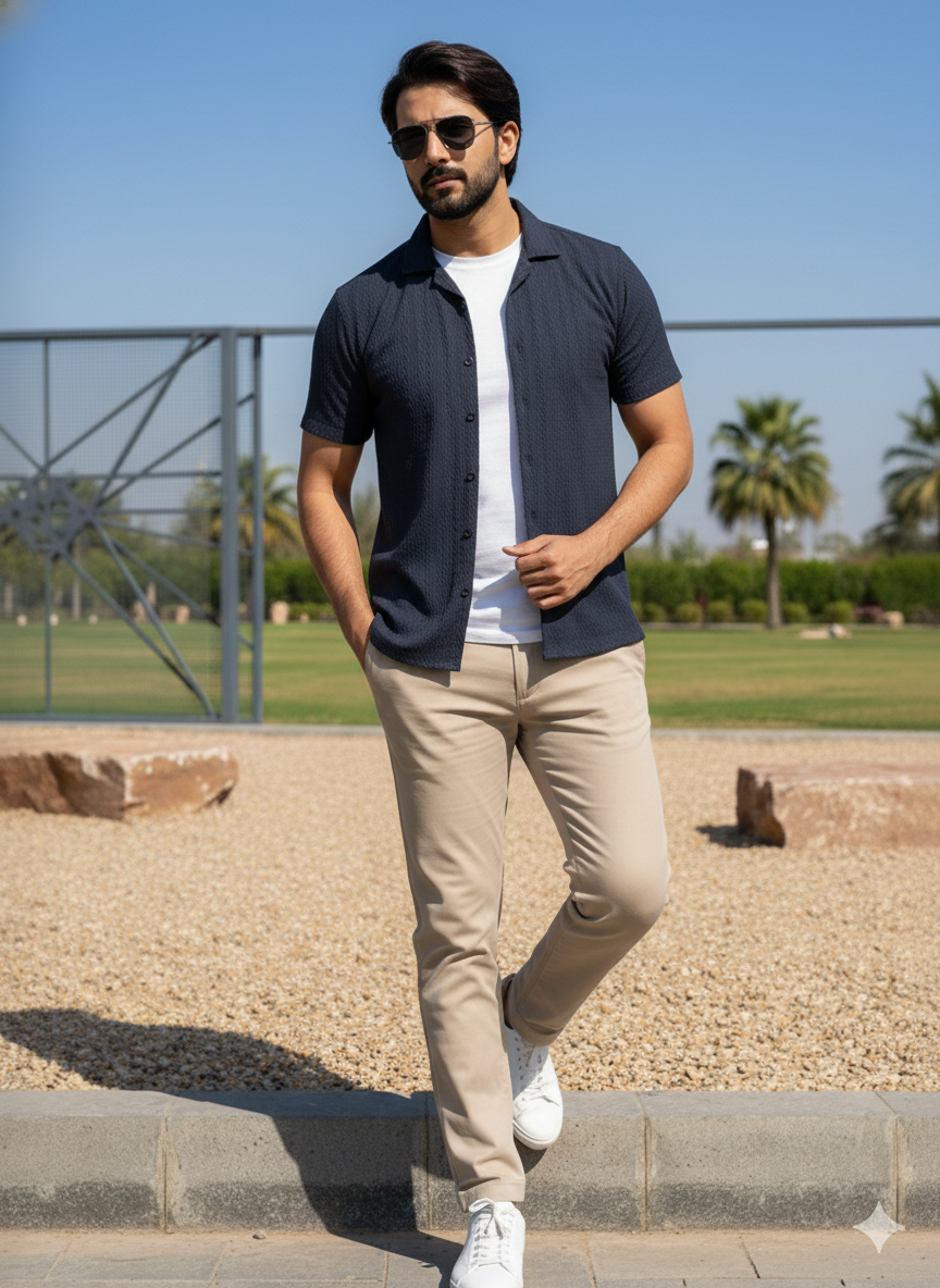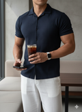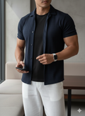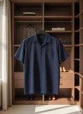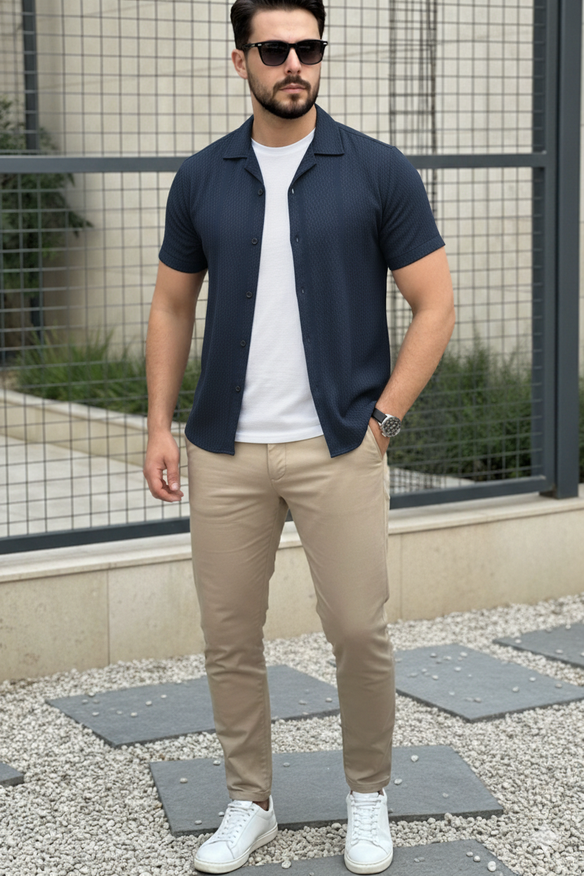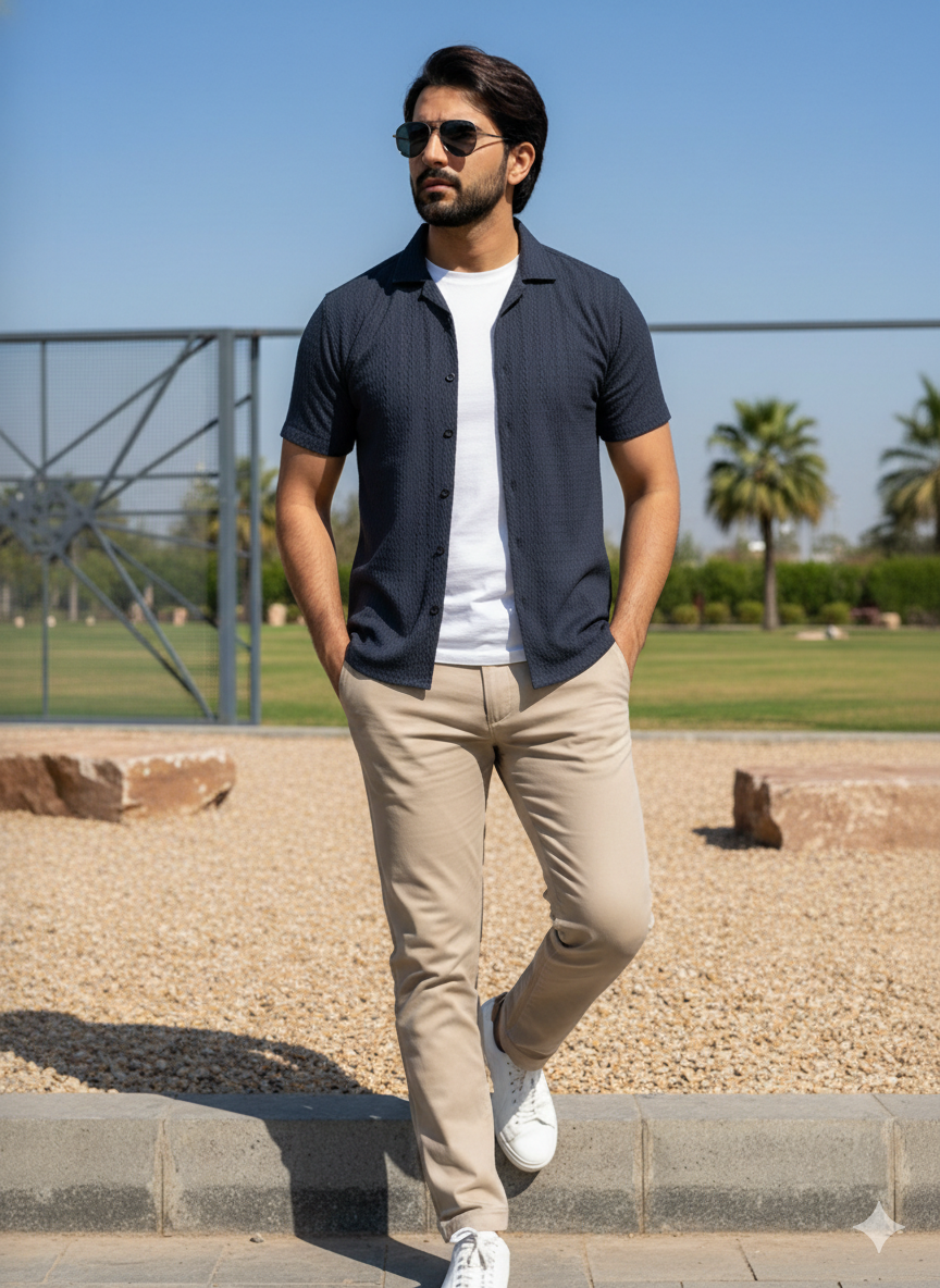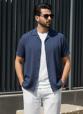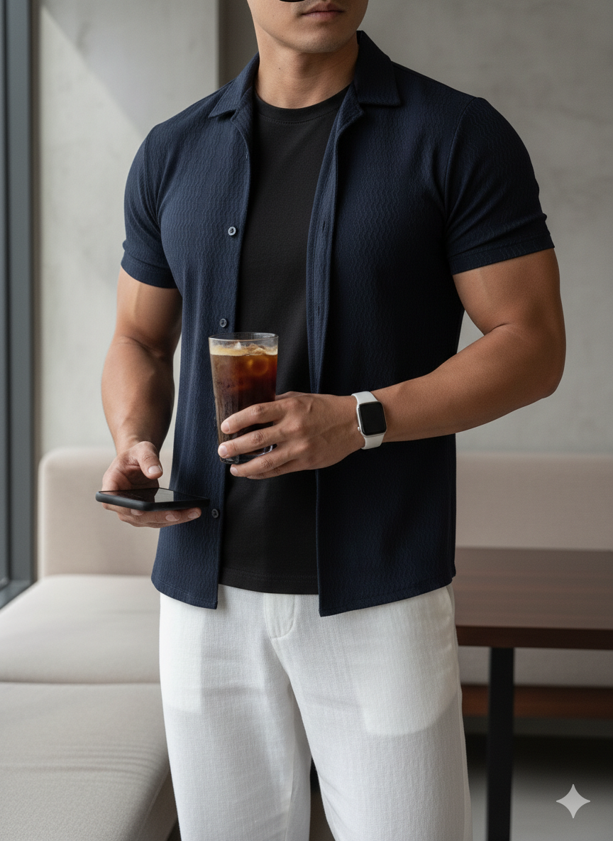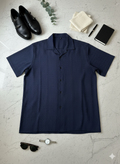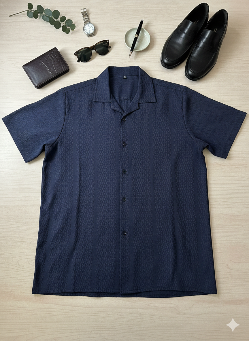 The Azure Textured Cuban Collar Shirt is designed for men who understand quiet luxury. Cut in a rich navy tone with subtle woven texture, this piece blends effortless summer ease with structured sophistication.