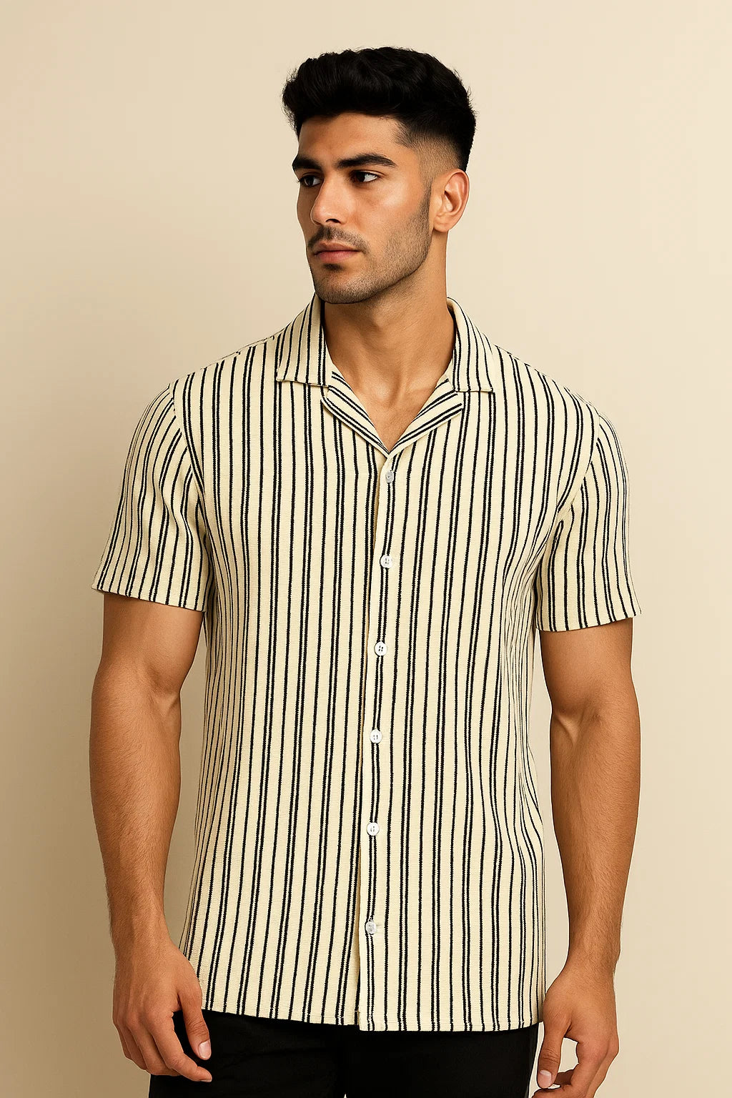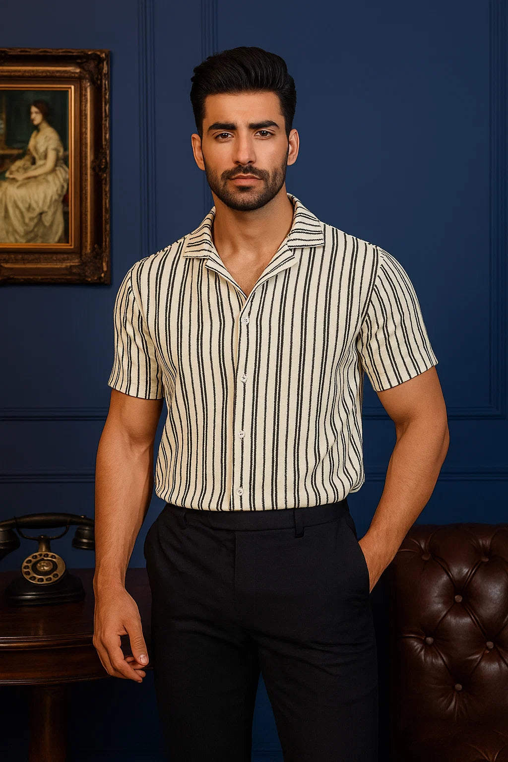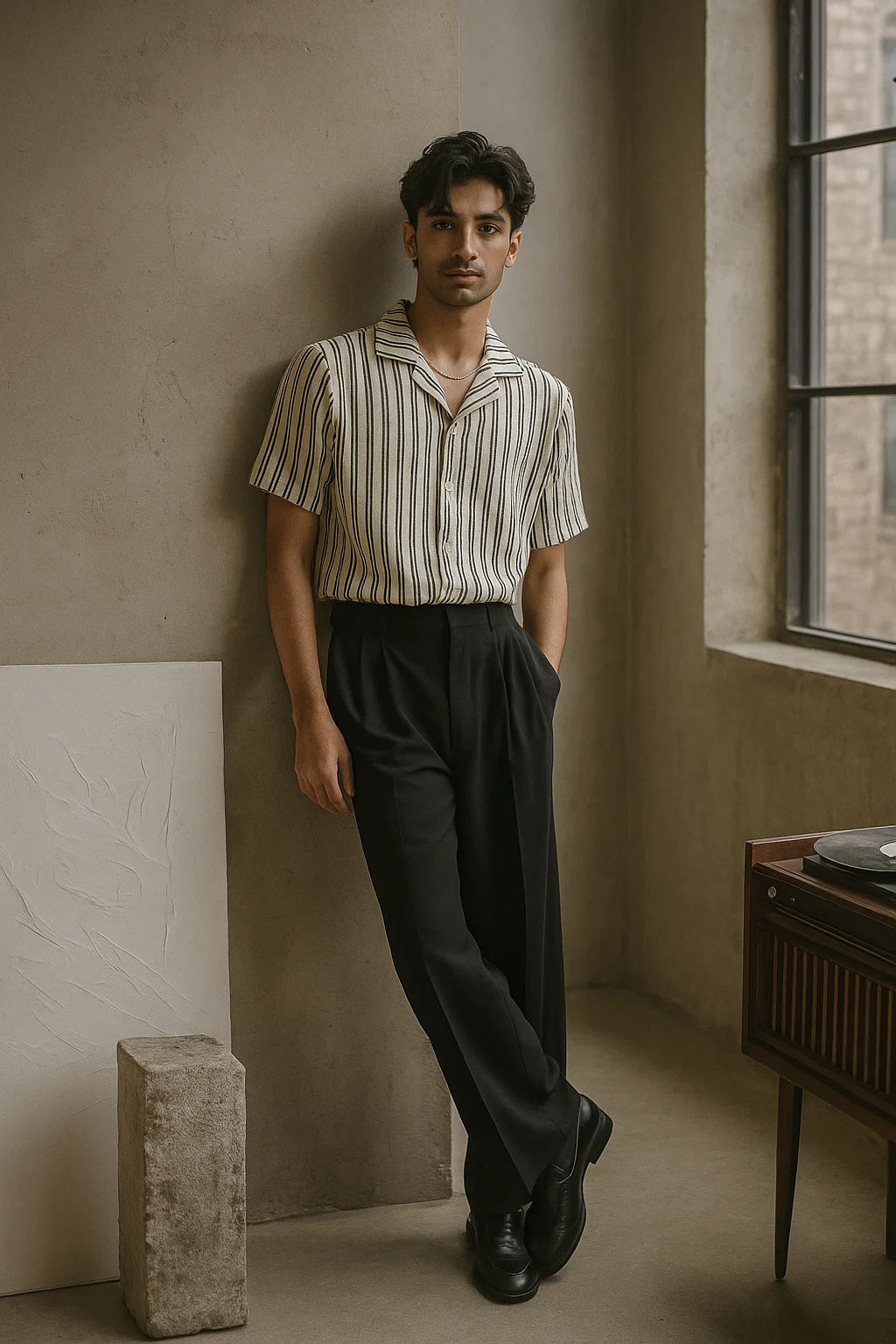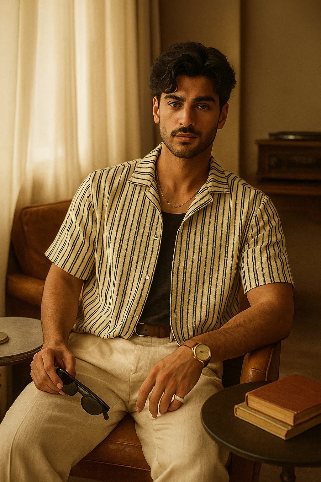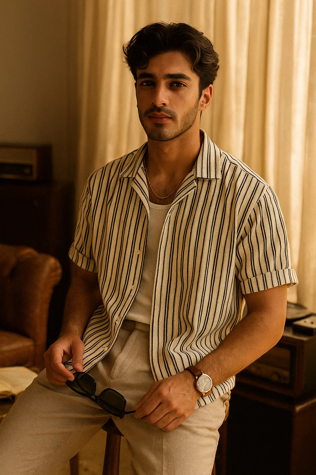 The Marakesh Stripe Shirt is a sartorial nod to effortless European summers — clean lines, breezy charm, and bold simplicity. Designed in a lightweight cream-white fabric with vertical black pinstripes, it features a relaxed Cuban collar and a soft drape that feels tailored yet laid-back. Whether buttoned up or worn open over a tank or tee, this shirt moves with style, not effort.