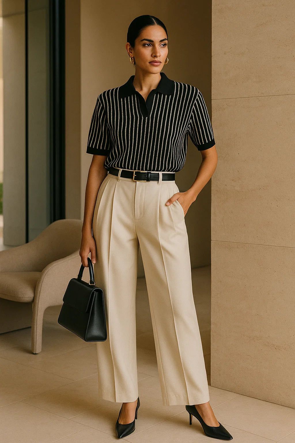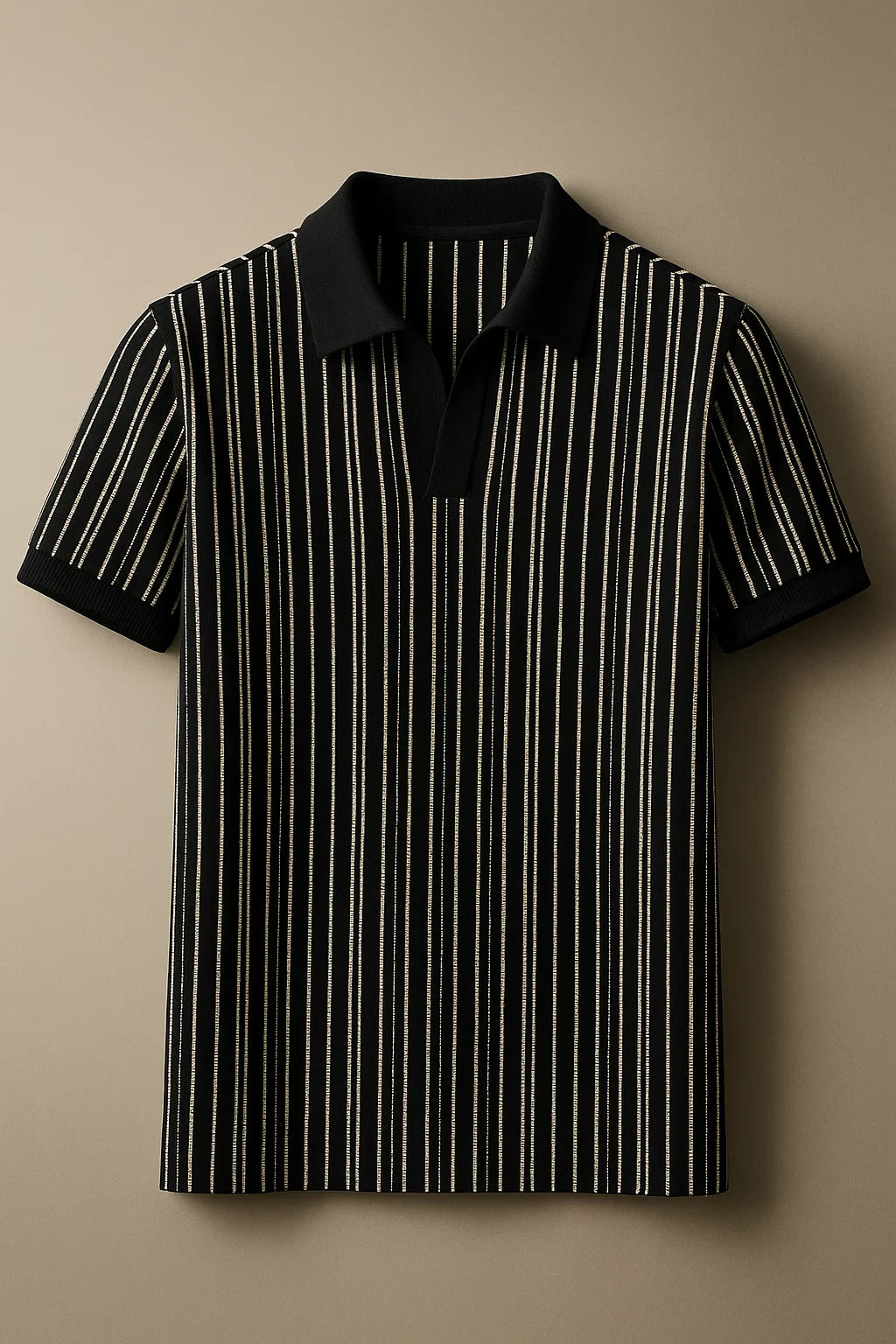 This statement polo blends effortless luxury with timeless edge. Crafted from premium textured fabric, it features fine vertical cream stripes against a deep black canvas — designed to elongate the silhouette and command attention subtly. The classic polo collar, clean placket, and refined sleeve fit make it a go-to for smart-casual layering or solo statement dressing.