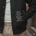 Crafted in jet black wool blend with premium faux leather sleeves, it draws inspiration from the country’s resilience and elegance. The deep tones represent power and dignity, while subtle green accents nod to the nation’s identity — a quiet symbol of where it all began.
