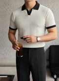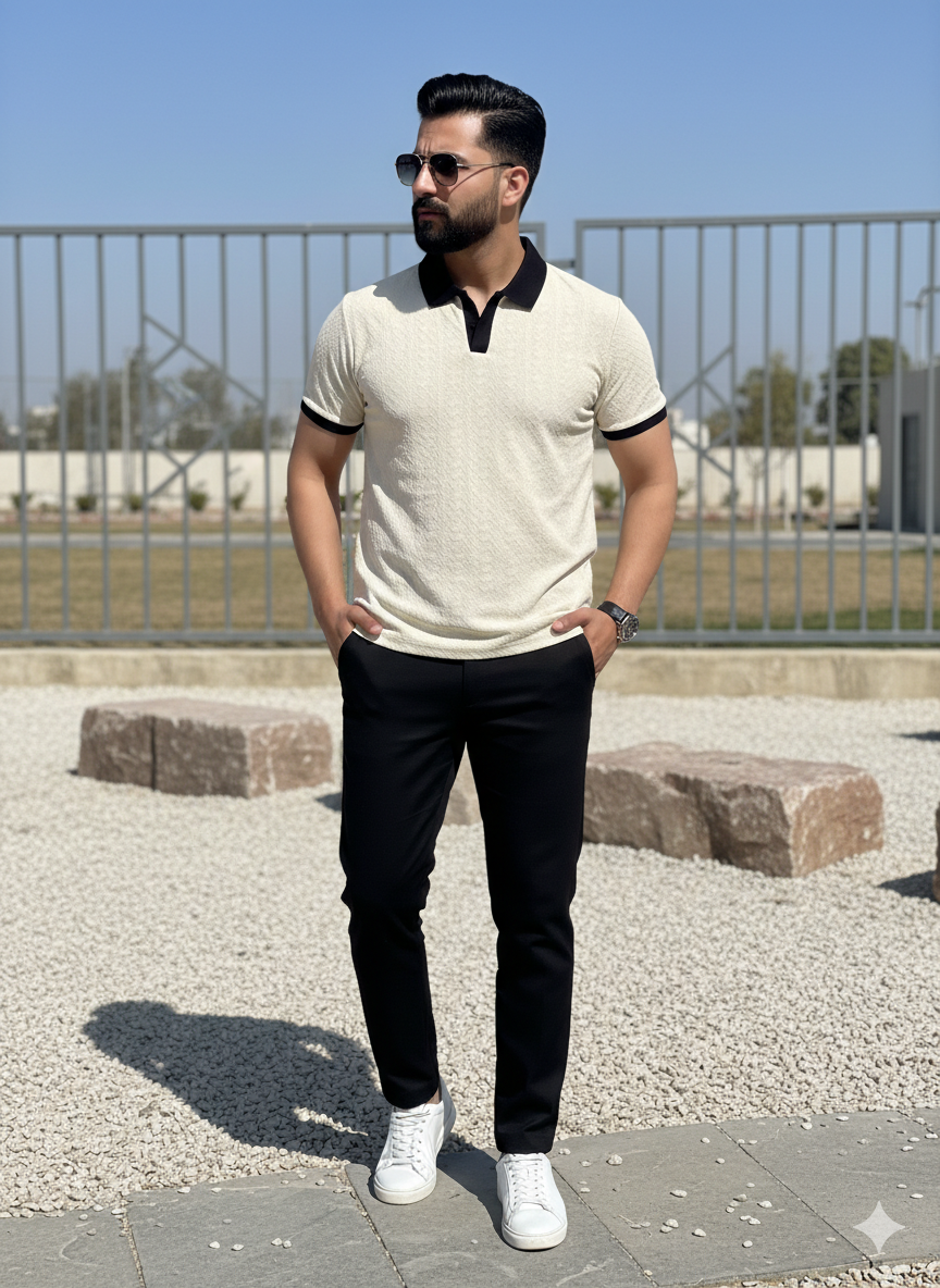 Designed in a sleek White base with subtle texture , this piece sharpens your silhouette while maintaining a relaxed, effortless feel. The solid black collar and sleeve cuffs add structure and contrast, giving it a refined finish that transitions seamlessly from daytime casual to evening smart.