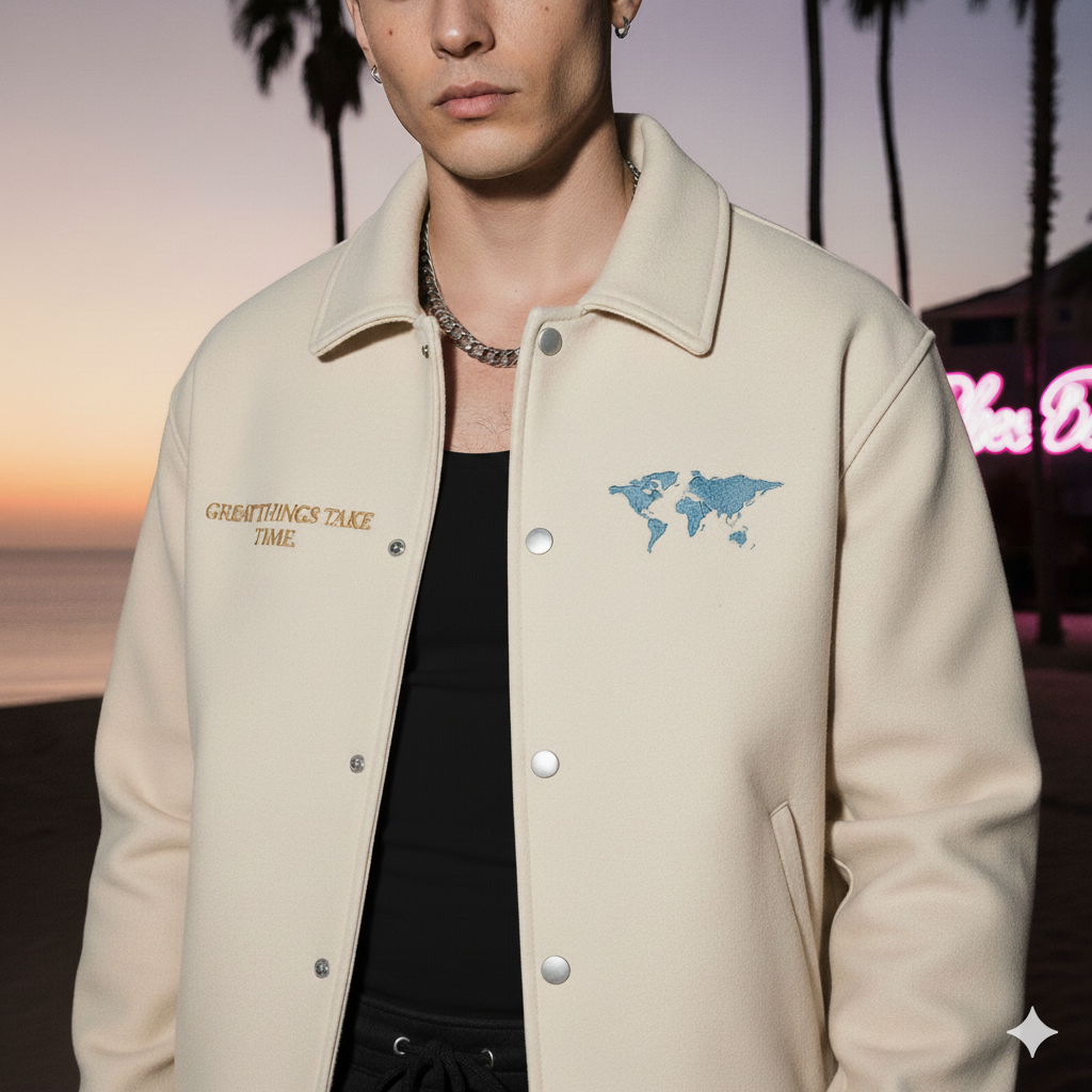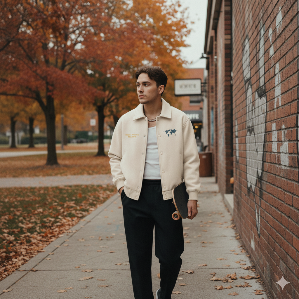 Timeless design meets modern craftsmanship. The Beige Varsity Jacket blends classic collegiate energy with Dominate Wear’s signature minimal-luxury aesthetic.